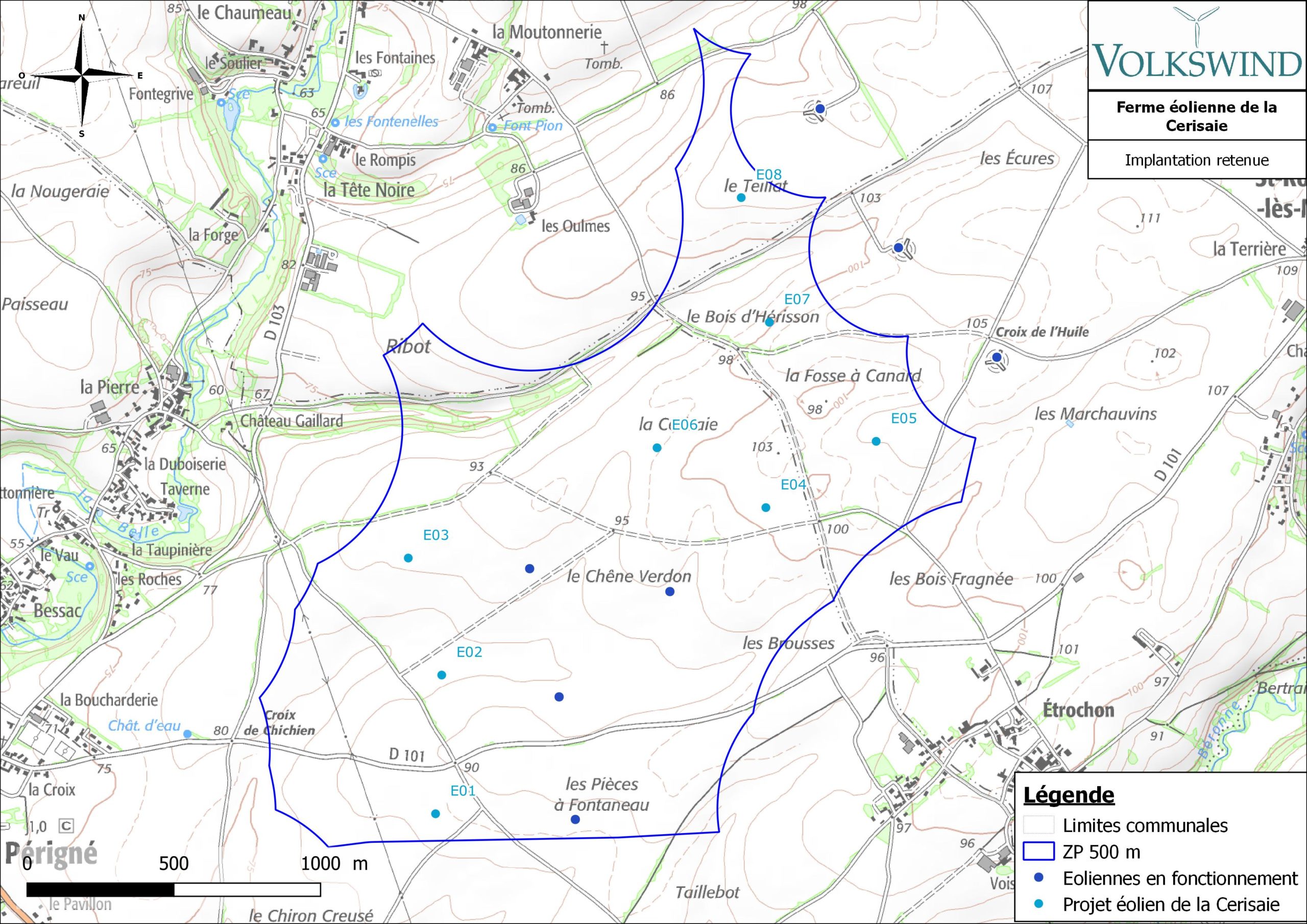La réglementation impose un éloignement de 500 mètres des habitations. Les études écologiques, paysagères et acoustiques réalisées, entre un et deux ans avant le dépôt du dossier de demande d'autorisation environnementale, ont permis de conclure à la faisabilité d’un projet éolien sur la zone. Ci-contre, la zone potentielle d’implantation du projet de la Cerisaie.