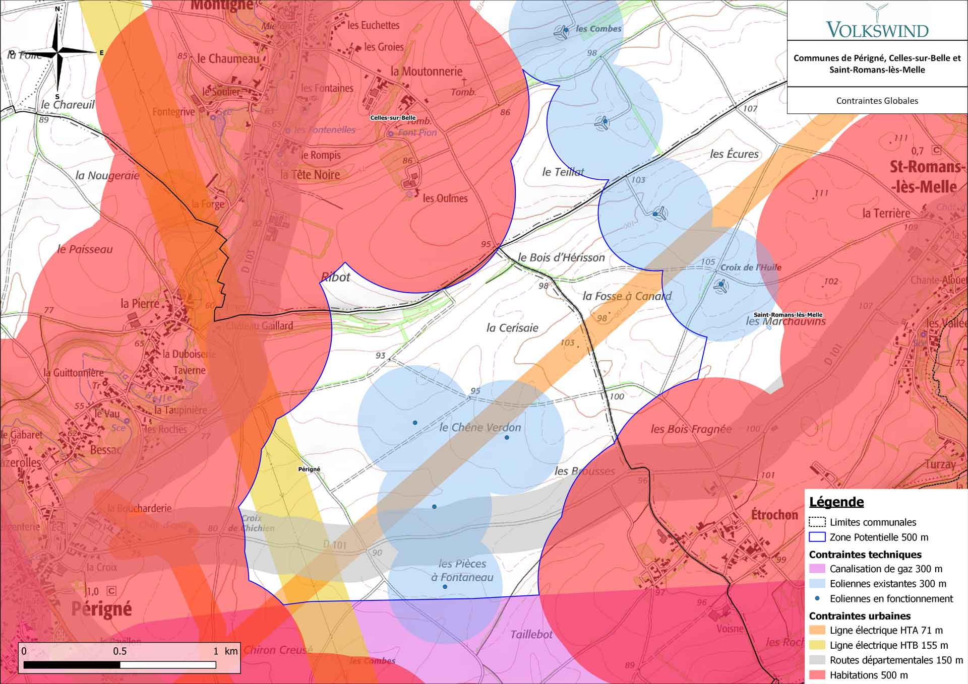 La zone de projet est située à cheval sur les communes de Périgné, Celles-sur-Belle et Saint-Romans-lès-Melle, en extension des parcs éoliens de Périgné et du Teillat. Cette zone a été retenue pour étudier la possibilité d’implantation d’un parc éolien, en raison des avantages suivants :